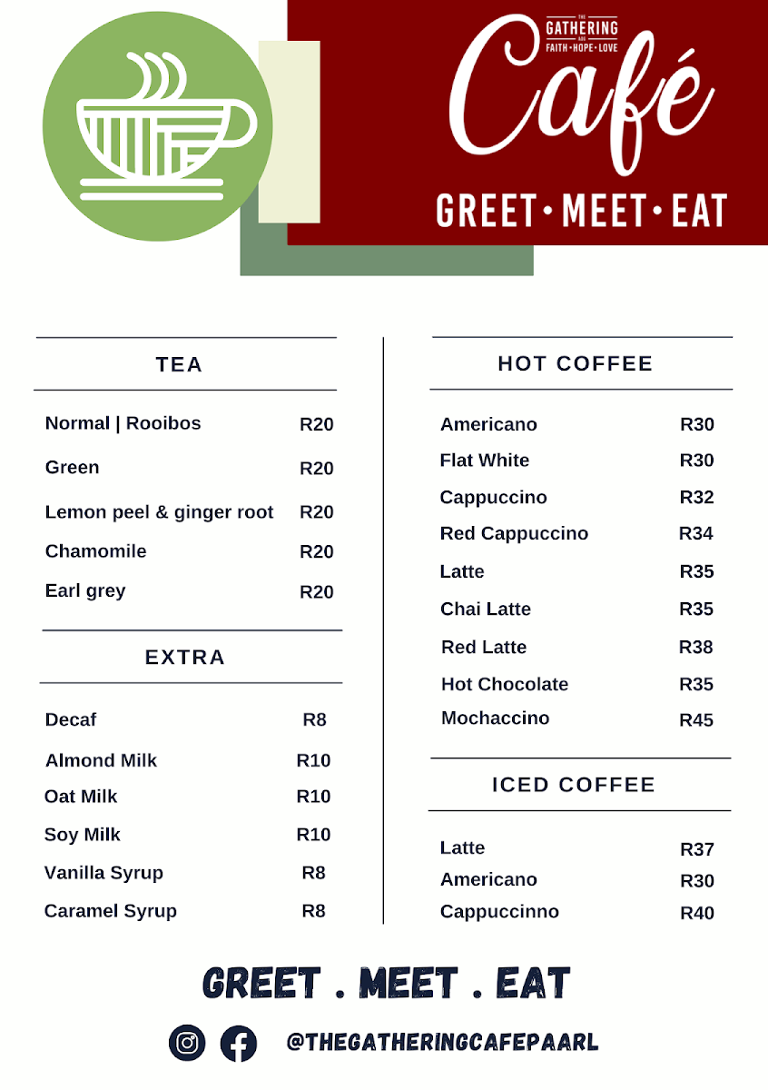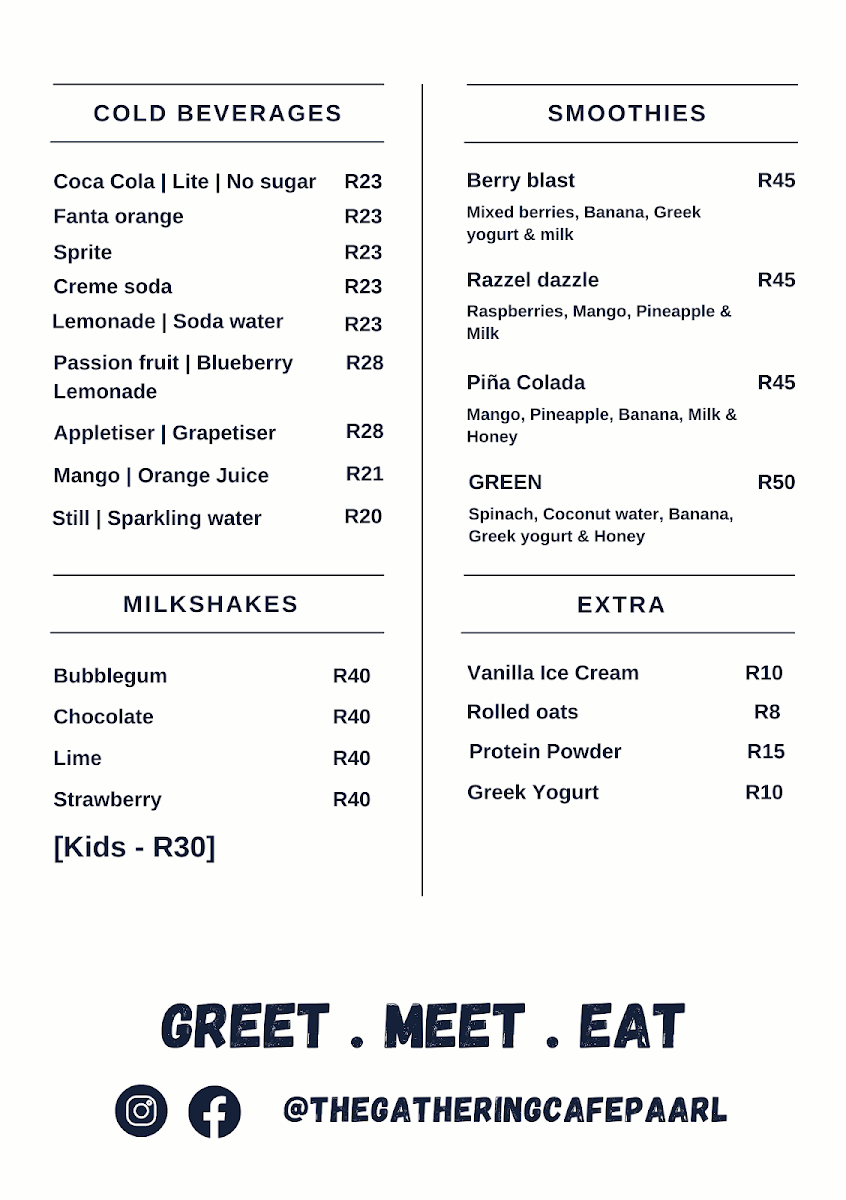 Welcome to The Gathering Café in Paarl, where every visit feels like a warm embrace. Nestled at 35/37 New Orleans Ave, this charming café is more than just a pit stop; it's a community hub designed to bring friends, family, and colleagues together over delicious food and comforting beverages.